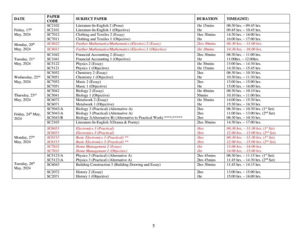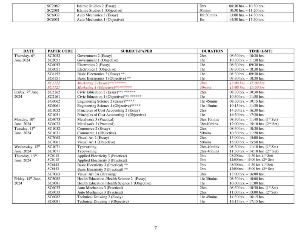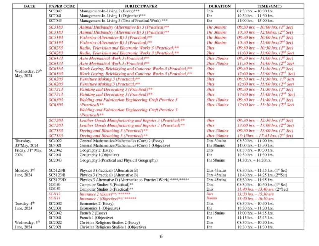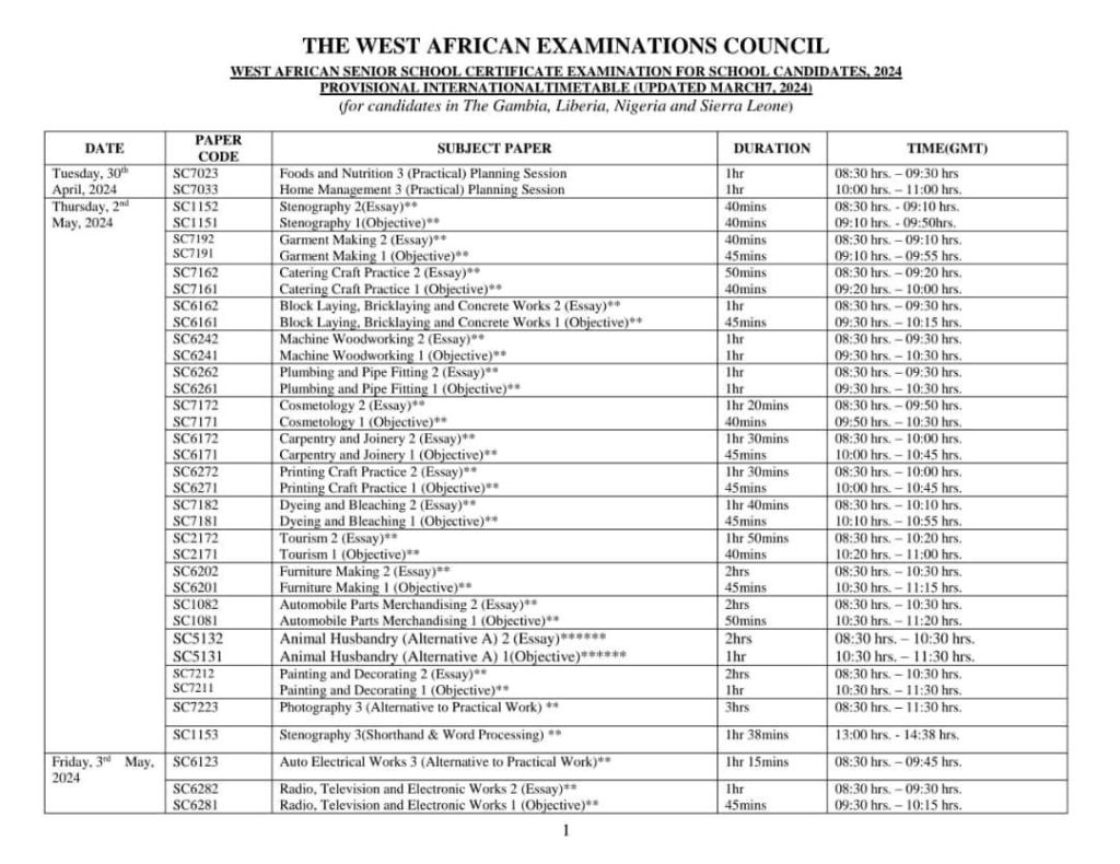 2024 WAEC TIMETABLE BELOW