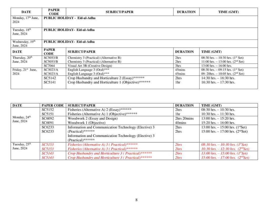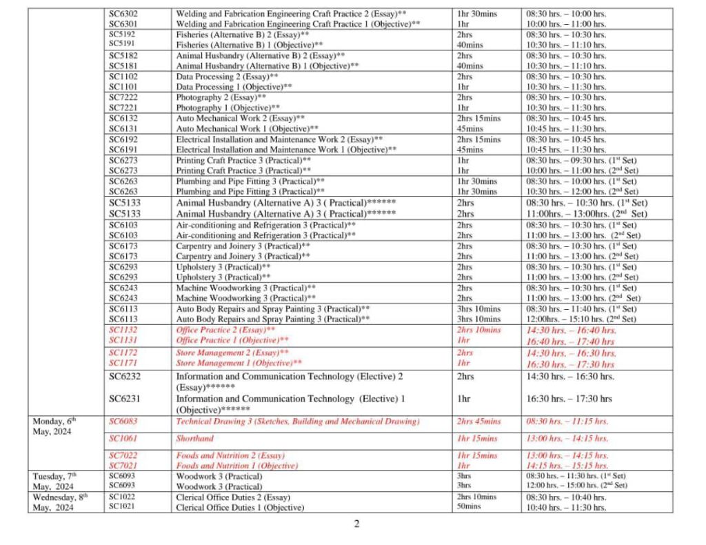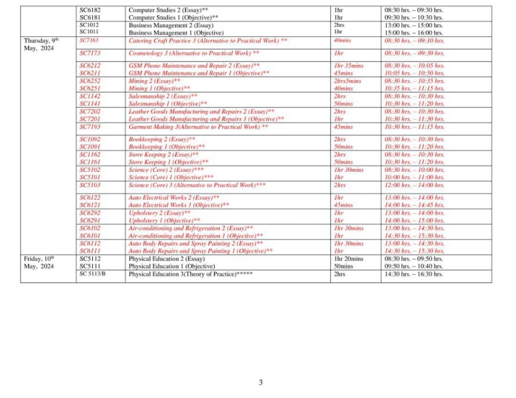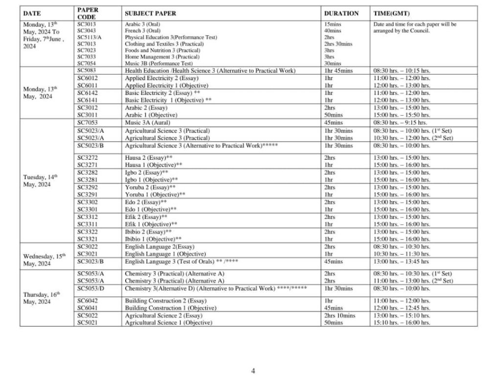 2024 WAEC TIMETABLE BELOW